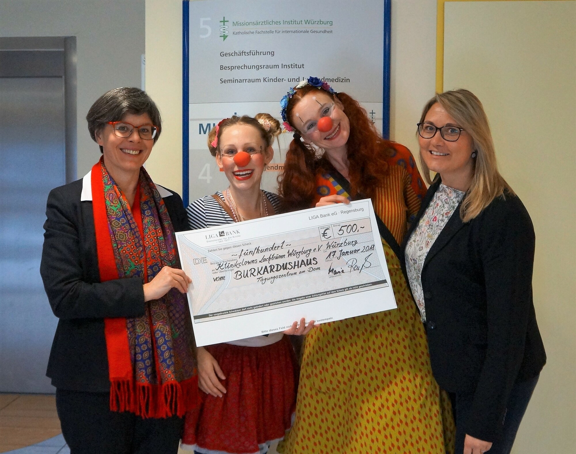 Maria Reuß, Leiterin des Würzburger Burkardushauses, und Verwaltungsfachangestellte Michaela Keupp haben einen Scheck im Wert von 500 Euro an den Würzburger Verein „Klinikclowns" überreicht. Die Spende kam im Rahmen der Adventsfeier des Tagungshauses zustande. Es wurden Lose für je fünf Euro verkauft, für die es unter anderem Kaffee, Kosmetikartikel, Pflanzen oder Übernachtungsgutscheine zu gewinnen gab. Die Preise wurden beispielsweise von Lieferanten, Hotels und Nachbarfirmen gesponsert.