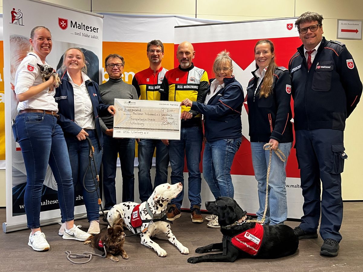 2000 Euro hat die Radsportgemeinschaft Würzburg (RSG) für das Würzburger Malteser Therapiebegleithundeteam gesammelt. Seit fünf Jahren machen die Therapiehunde Menschen in Senioreneinrichtungen, Hospizen oder Kinderheimen aber auch zuhause mit ihren Besuchen eine Freude.