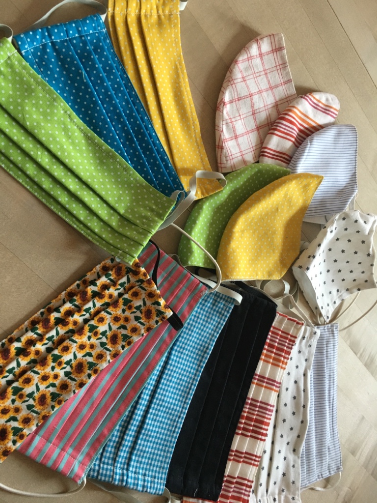Ende März wurde ich von unserem Sohn und einer Bekannten angesprochen, ob ich mich nicht beteiligen möchte und für ein Krankenhaus in München und Sozialstationen Masken nähen könnte. Da ich sehr gerne nähe war das in Corona -Zeiten eine sinnvolle Abwechslung. Ich machte mich im Internet auf die Suche nach Schnitten und probierte einige Modelle aus. Dann kam wieder über eine Bekannte eine Anfrage ob ich auch für unsere Caritas-Sozialstation nähen würde. So nähte ich die ersten 200 Masken. Mir kam dann die Idee, dass in unserer Gemeinde vielleicht Senioren Bedarf hätten und ich fragte ob Anita Hermanovski (unsere Orgelspielerin) in Ihrem Lebensmittel- und Gemischtwarenladen einige Masken auslegen würde. Dann kam die Maskenpflicht und die Masken waren gefragt. Wir wollten sie nicht verkaufen, sondern gegen eine Spende für die Orgelrenovierung abgeben. Anfangs nähte ich eine aufwändigere Maske, ging dann aufgrund der starken Nachfrage auf einen rationellen Schnitt über. Auch teilten wir uns die Arbeit. Ich nähte, Helga Büchs zog die Gummis ein und Anita Hermanovski bot sie im Laden an.