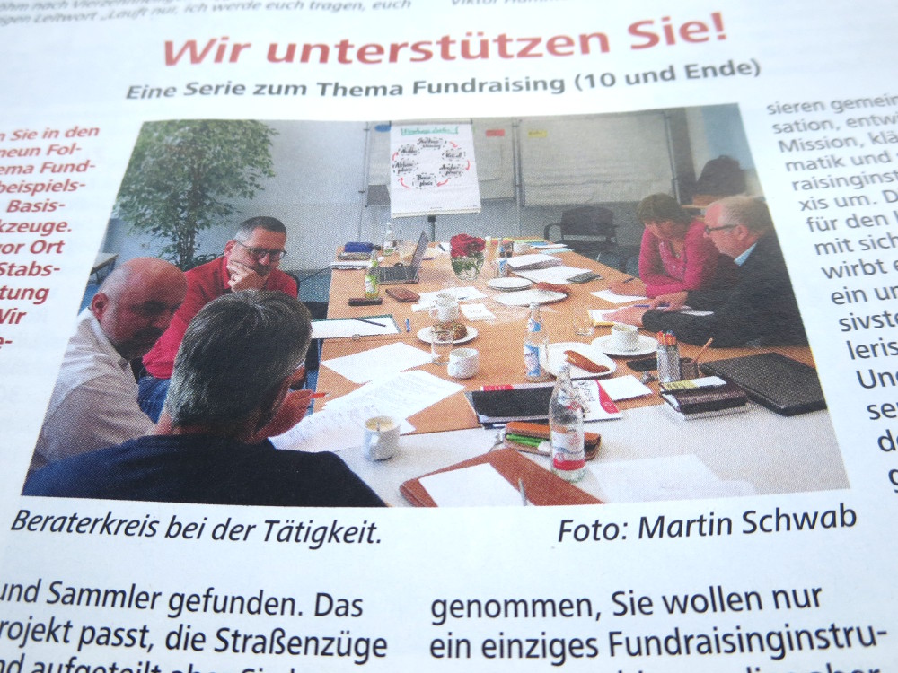Stabsstellenleiter Dr. Martin Schwab veröffentlicht derzeit eine Serie zum Thema Fundraising im Würzburger katholischen Sonntagsblatt, der Kirchenzeitung der Diözese Würzburg. Soeben ist die zehnte und letzte Folge erschienen. Sie zeigt auf, wie die Stabsstelle Fundraising die kirchlichen Einrichtungen vor Ort unterstützten kann – von der Fachberatung über Workshops bis zur Projektberatung. Als kleinen Service lässt Ihnen die Stabsstelle Fundraising den entsprechenden Artikel persönlich zukommen. Eine Mail an martin.schwab@bistum-wuerzburg.de genügt.